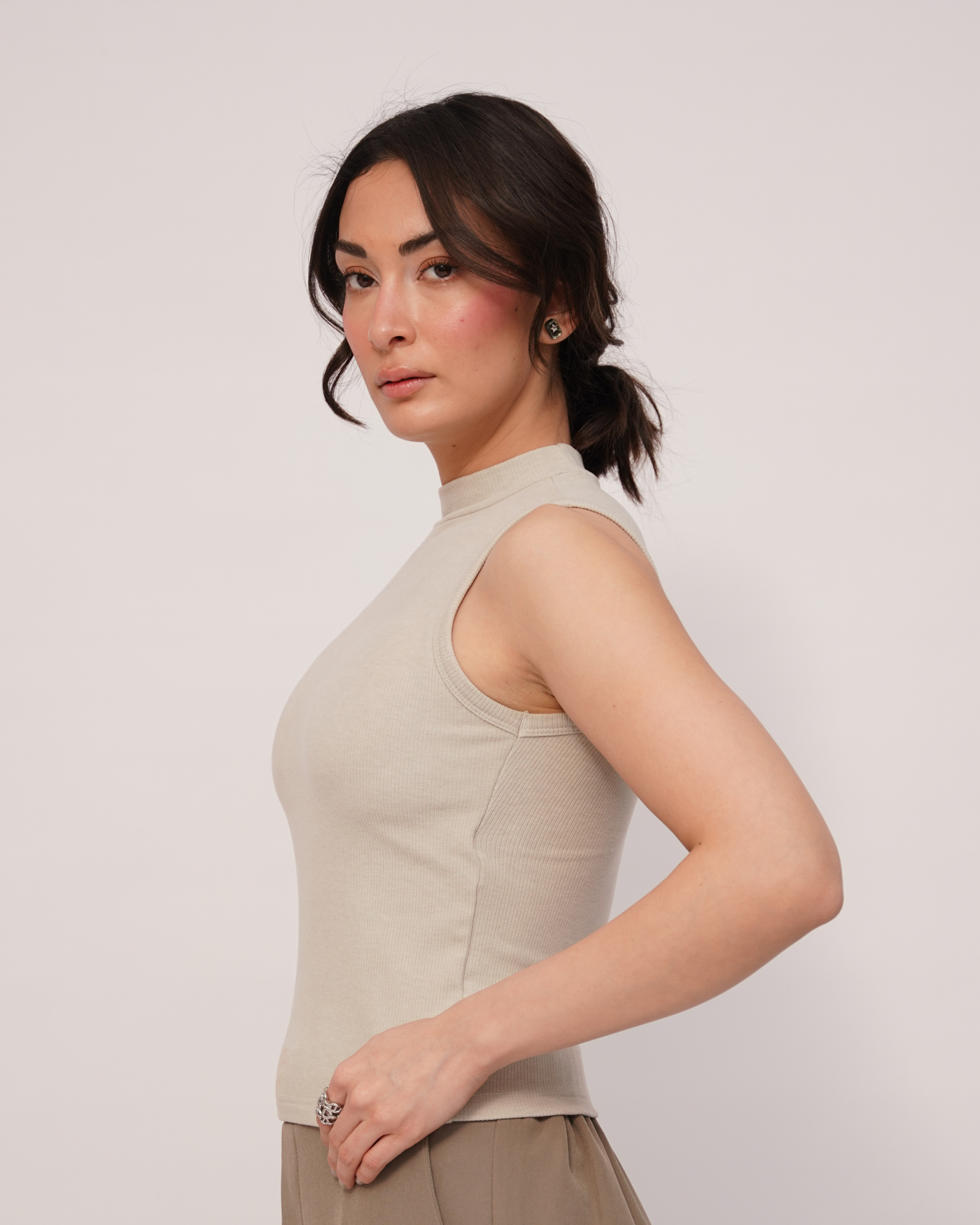 Upgrade your essentials with this mock-neck sleeveless ribbed tank featuring built-in, non-removable cotton padding for secure bra-free support. Designed to be clean, structured, and flattering, it’s a versatile piece for layering or wearing solo.
